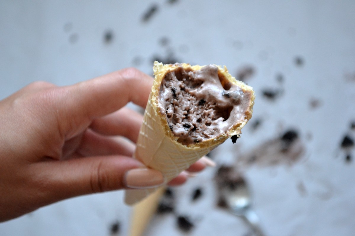 Mleko kokosowe, kakao i cukier umieść w jednym naczyniu i zblenduj na jednolitą masę. Schłodź w lodówce. Po wyjęciu dodaj ciastka oreo i zmiksuj. Włóż do zamrażarki (podczas chłodzenia miksuj co jakiś czas, aby lody były puszyste).